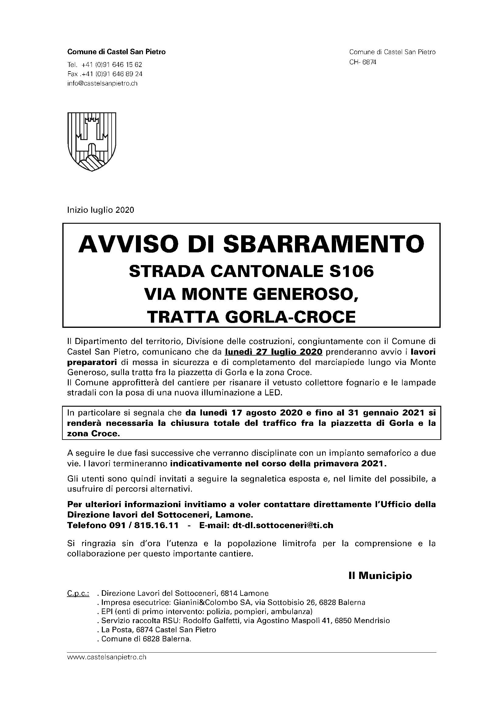 Il Dipartimento del Territorio, Divisione delle costruzioni, congiuntamente con il Comune di Castel San Pietro, comunicano che a partire da lunedì 17 agosto 2020 e sino si renderà necessaria la chiusura totale al traffico della strada cantonale S106 - Via Monte Generoso per i lavori di completamento del marciapiede, di risanamento del vetusto collettore fognario e di sostituzione delle lampade stradali. Coloro che desiderano eventuali ulteriori informazioni, sono invitati a contattare direttamente l'Ufficio della Direzione lavori del Sottoceneri a Lamone (telefono: 091 / 815 16 11 / E-mail: dt-dl.sottoceneri@ti.ch). Si ringrazia sin d'ora la spettabile l'utenza e la popolazione limitrofa per la comprensione e la collaborazione in vista di questo importante cantiere. |