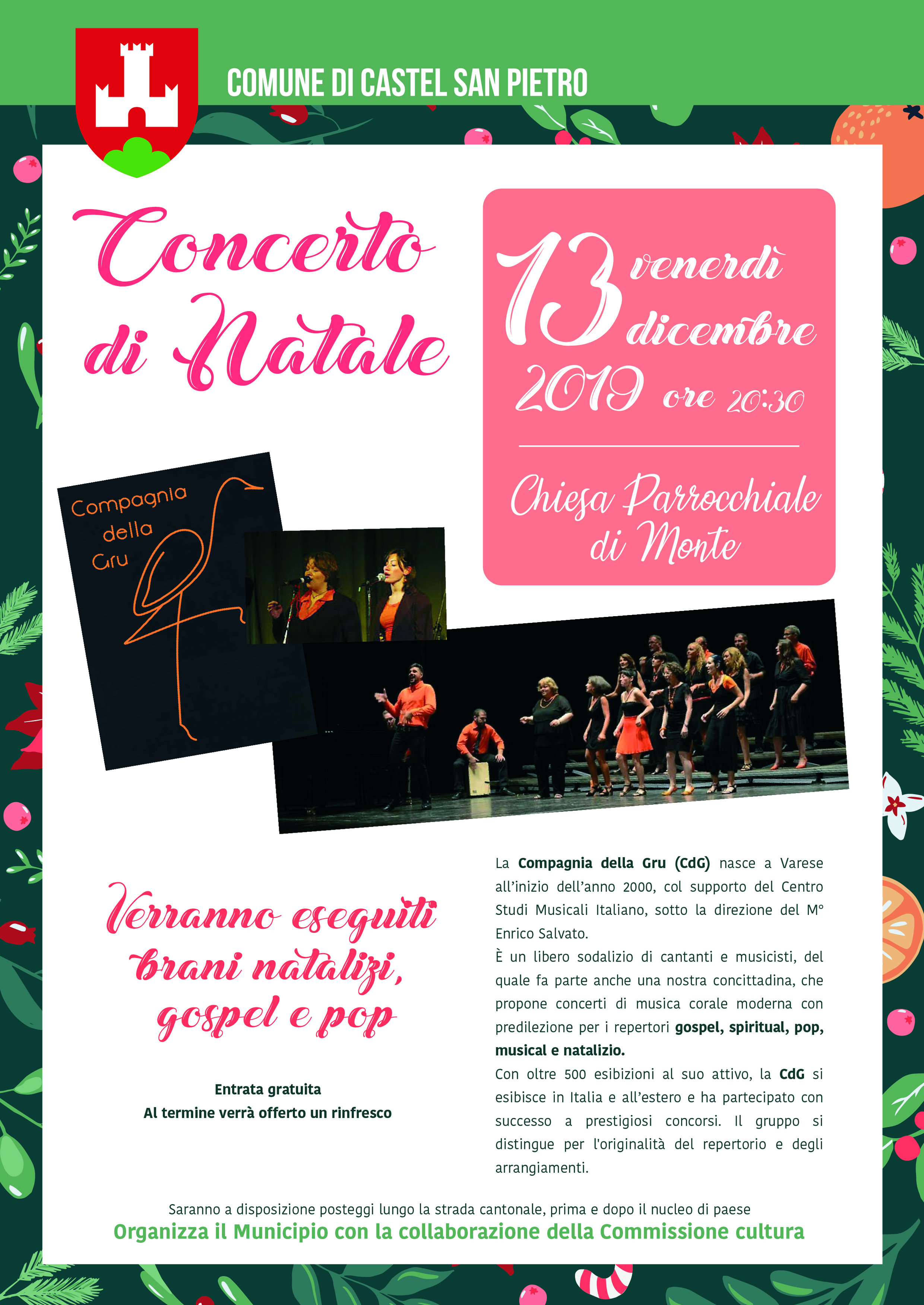 Per avvicinarci nel migliore dei modi alle prossime festività natalizie, il Municipio di Castel San Pietro, con la collaborazione della locale Commissione cultura, vi invitano ad assistere al bellissimo concerto che avrà luogo