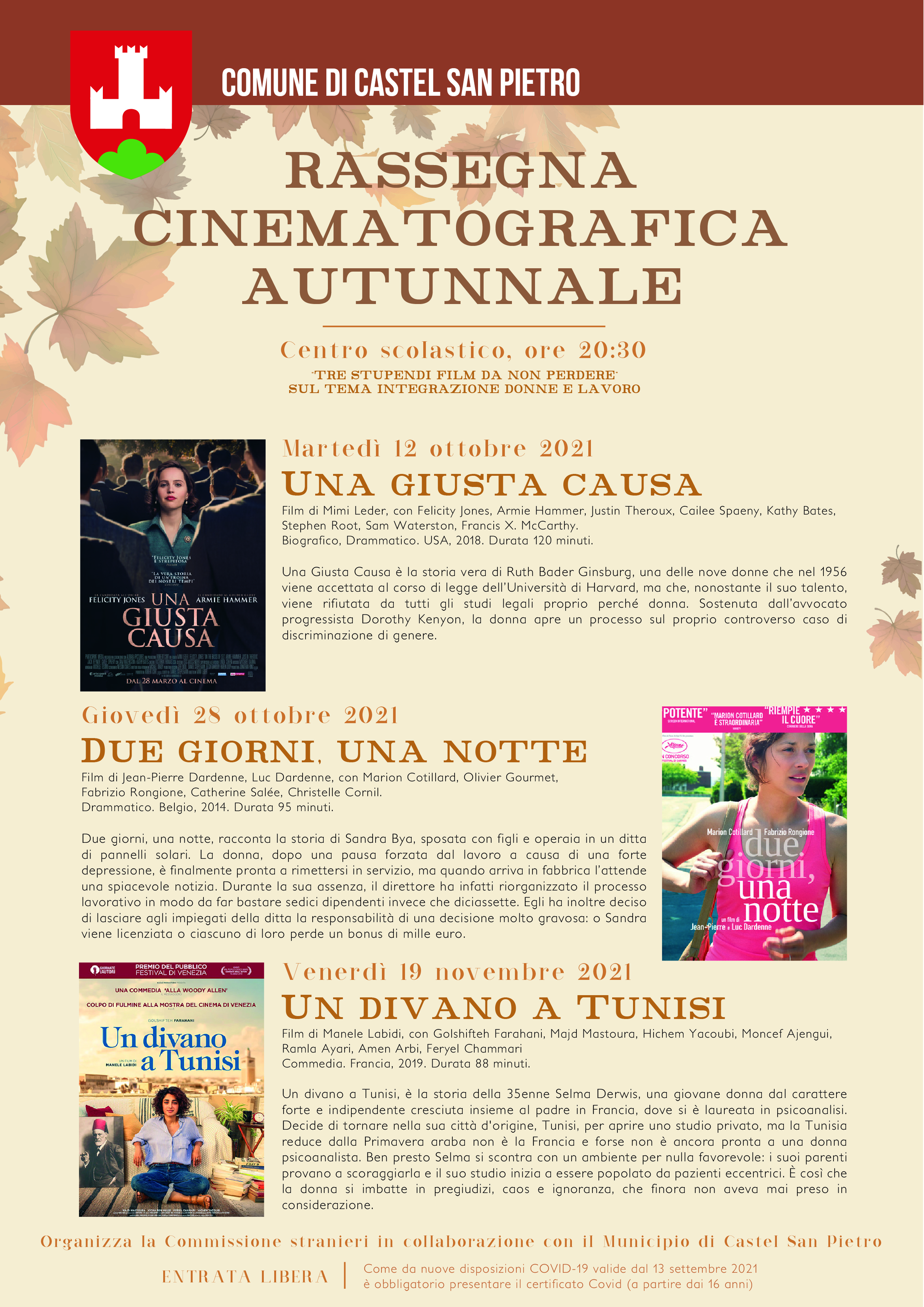 La locale Commissione stranieri, in collaborazione con il Municipio, ha il piacere di invitarvi ad assistere alla visione di tre stupendi film sul tema "integrazione donne e lavoro", che verranno proiettati nel corso delle prossime settimane su grande schermo.